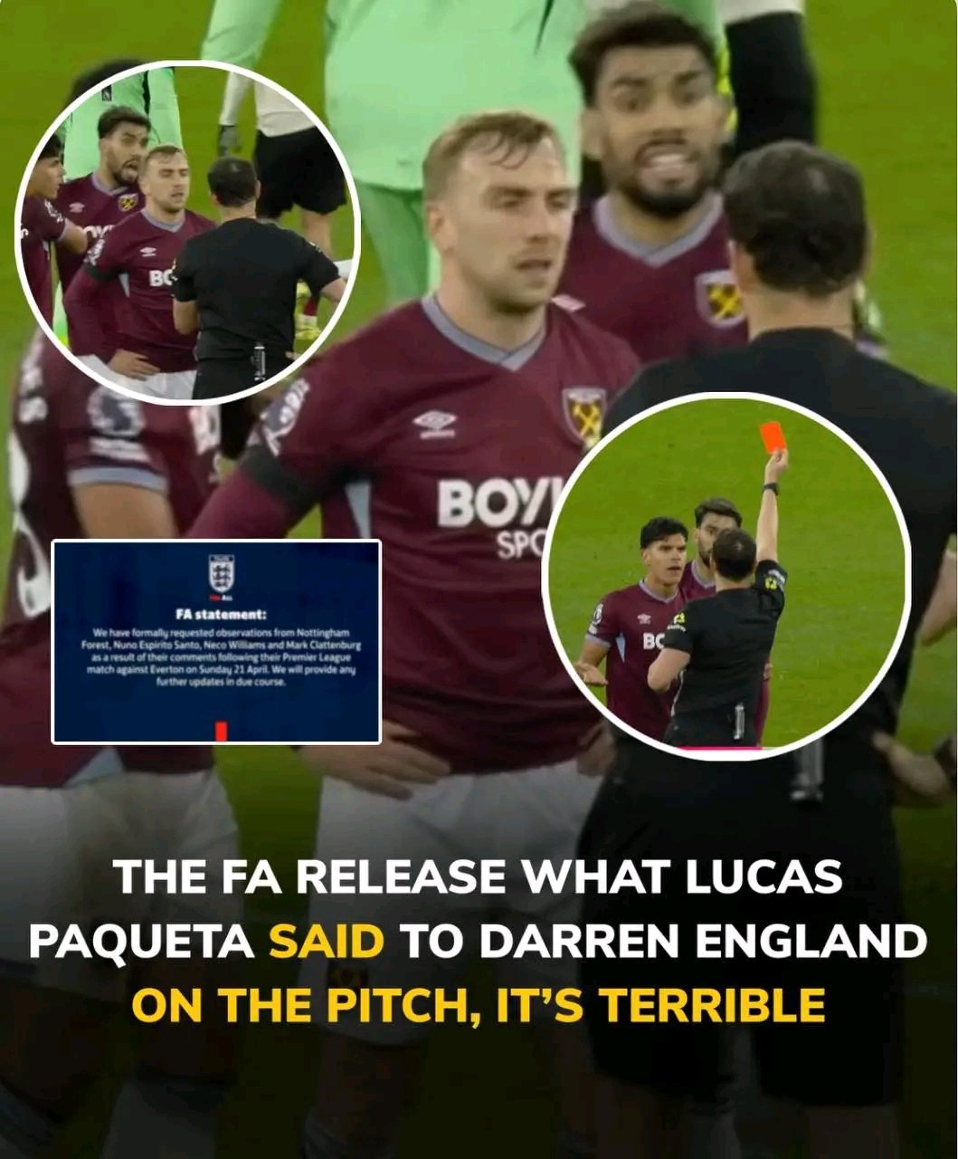 The fallout from Lucas Paquetá’s red card against Liverpool has escalated dramatically, and West Ham United supporters have flooded social media with anger, confusion, and a sense of betrayal. At the centre of the storm is the referee, Darren England, and a now-viral claim suggesting he said: “What he said to me, then I gave him the red card — it’s not okay.”