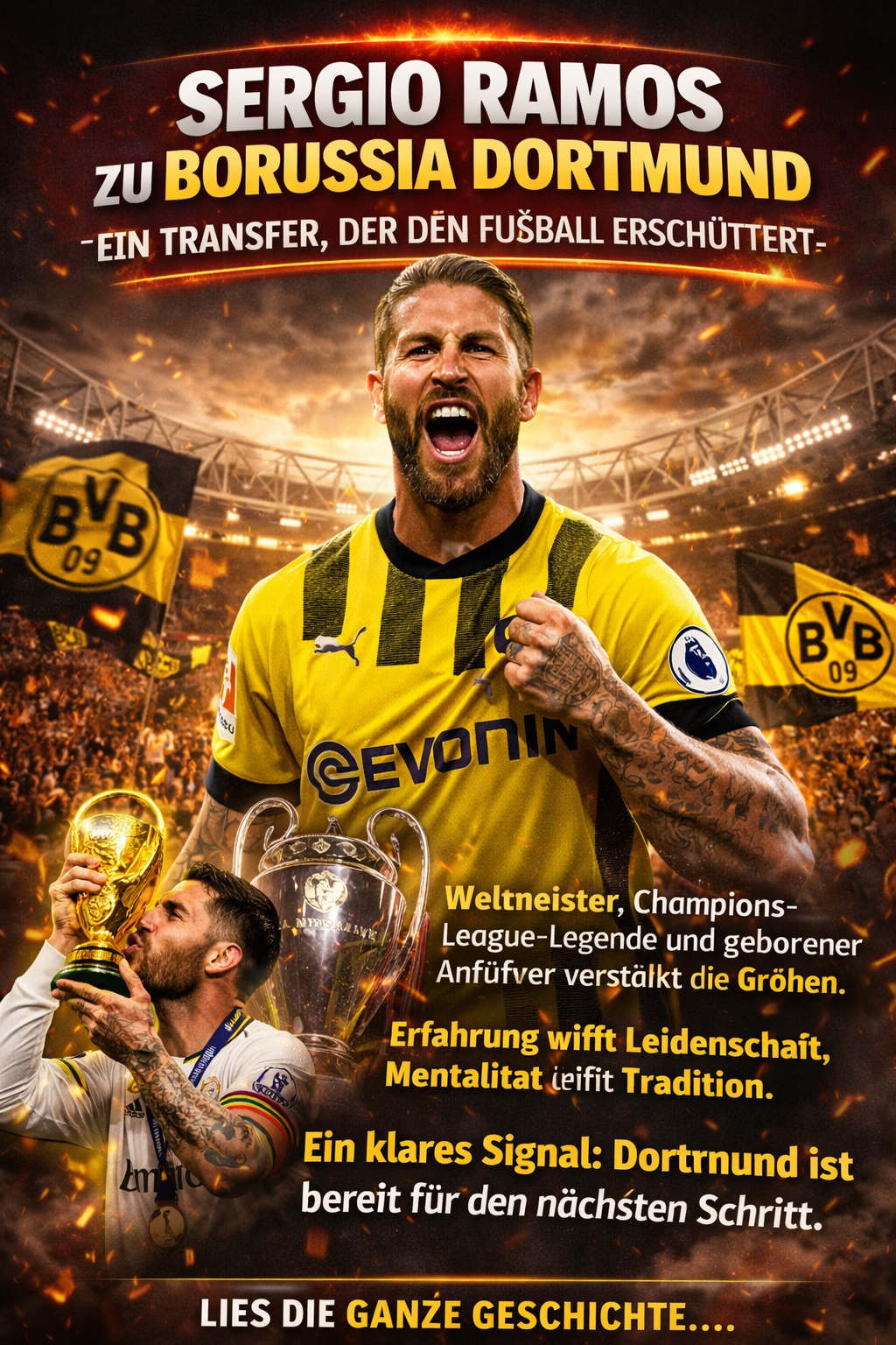 Home » **Sergio Ramos zu Borussia Dortmund – ein Transfer, der den Fußball erschüttert.** Weltmeister, Champions-League-Legende und geborener Anführer verstärkt die Großen. Erfahrung trifft Leidenschaft, Mentalität trifft Tradition. Ein klares Signal: Dortmund ist bereit für den nächsten Schritt. **Lies die ganze Geschichte…